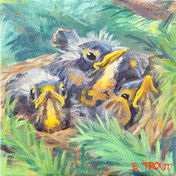 Each oil painting captures a moment in time of the distinct personalities and behaviors of a variety of bird species. I had the joyful privilege this year of observing and recording the amazing private lives of robins in four nests in my yard.